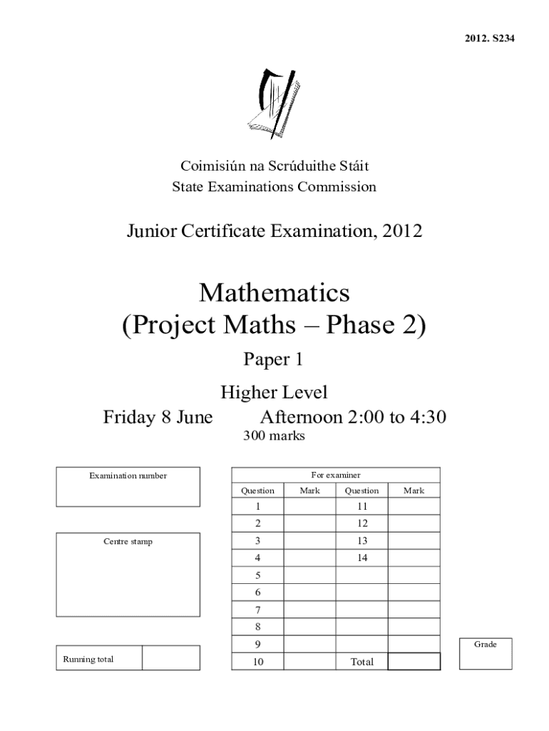 2012. S234Coimisin Na Scrduithe Suit State Examinations Commission Junior Certificate Examination, 2012Mathematics (Project Math Phase 2) Paper 1 Higher Level Friday 8 June Afternoon 2:00 to 4:30