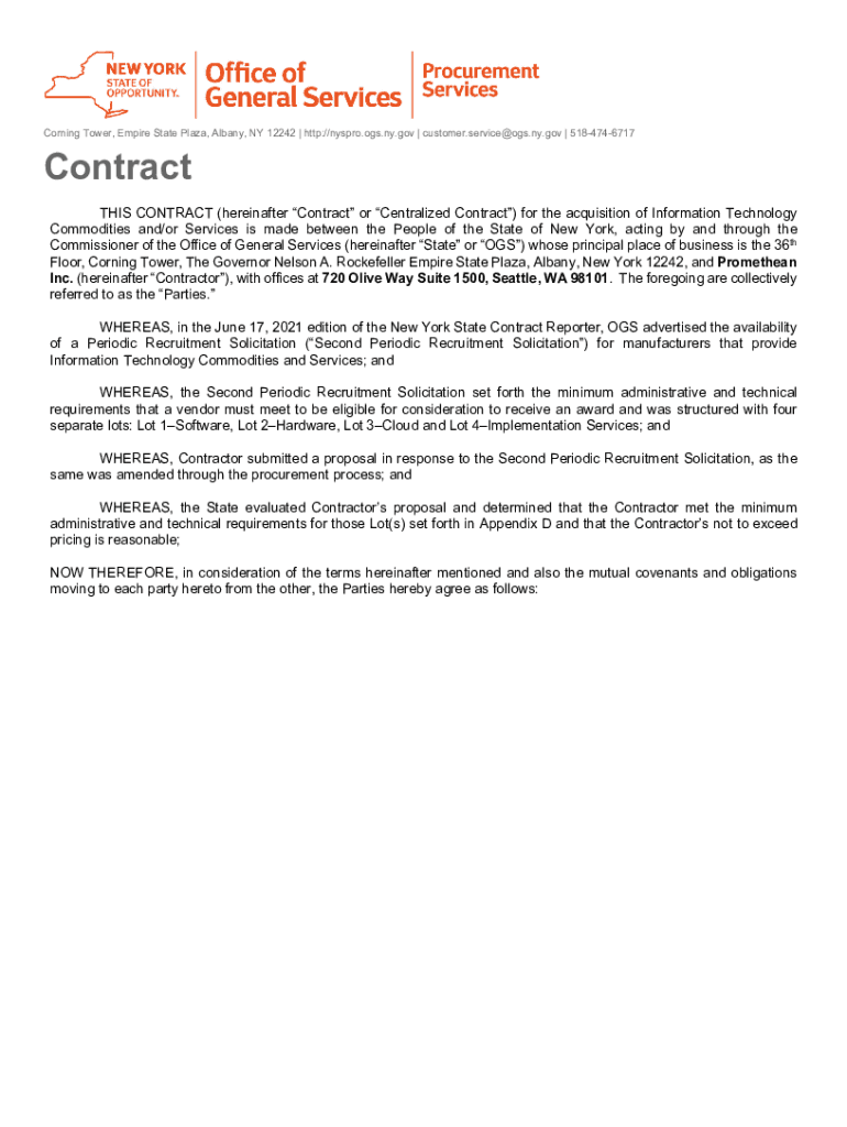 Corning Tower, Empire State Plaza, Albany, NY 12242 | http://nyspro.ogs.ny.gov | customer.service@ogs.ny.gov | 5184746717Contract THIS CONTRACT (hereinafter Contract or Centralized Contract) for the