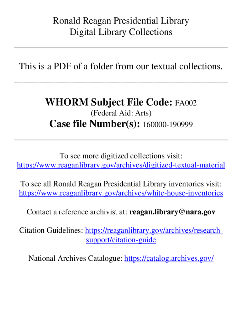 Ronald Reagan Presidential Library Digital Library CollectionsThis is a PDF of a folder from our textual collections. WHOM Subject File Code: FA002 Case file(Federal Aid: Arts) Number(s): 160000190999To