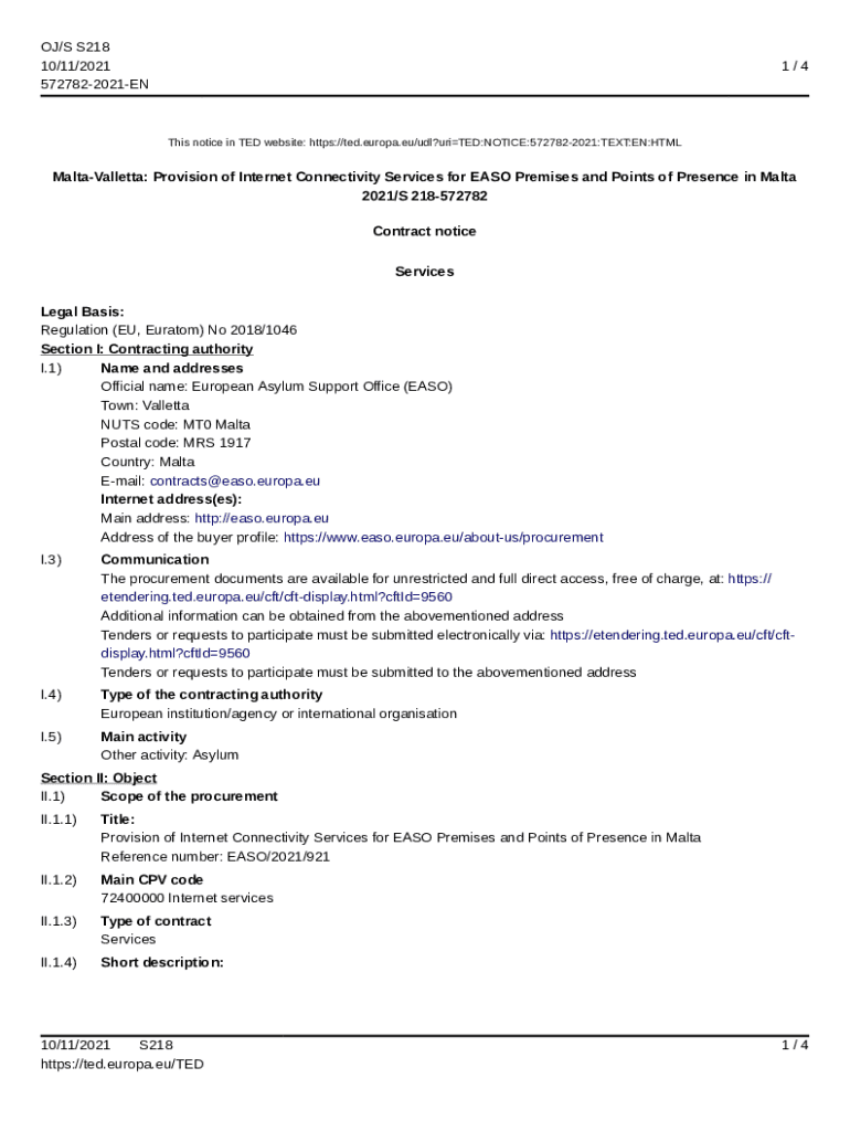 OJ/S S218 10/11/2021 5727822021EN1/4This notice in TED website: https://ted.europa.eu/udl?uriTED:NOTICE:5727822021:TEXT:EN:HTMLMaltaValletta: Provision of Internet Connectivity Services for EASO Premises