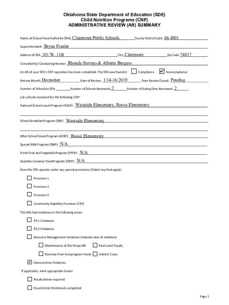 Oklahoma State Department of Education (SDE) Child Nutrition Programs (CNP) ADMINISTRATIVE REVIEW (AR) SUMMARY Name of School Food Authority (SFA): Clare more Superintendent:Public SchoolsCounty District
