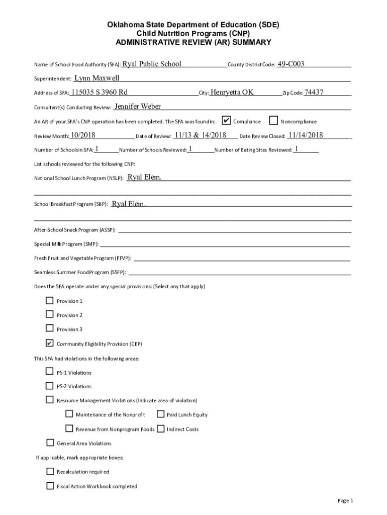 Get the free Name of School Food Authority (SFA): Ryal - sde ok
