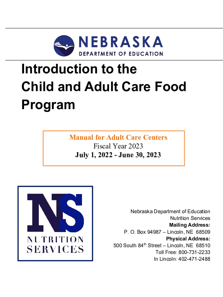 Introduction to the Child and Adult Care Food Program Manual for Adult Care Centers Fiscal Year 2023 July 1, 2023, June 30, 2023Nebraska Department of Education Nutrition Services Mailing Address: