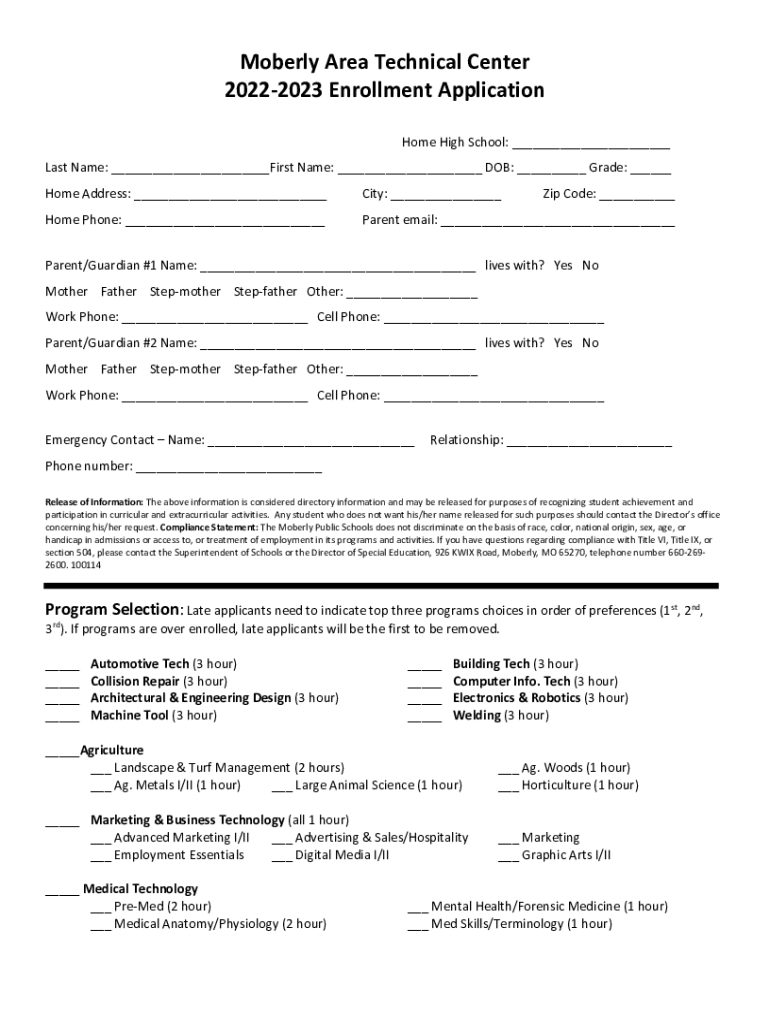 Soberly Area Technical Center 20222023 Enrollment Application Home High School: ___ Last Name: ___First Name: ___ DOB: ___ Grade: ___ Home Address: ___City: ___Zip Code: ___Home Phone: ___Parent email: