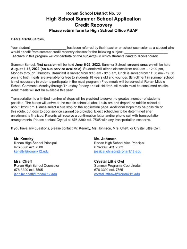 Roman School District No. 30High School Summer School Application Credit Recovery Please return form to High School Office ASAP Dear Parent/Guardian, Your student ___ has been referred by their teacher