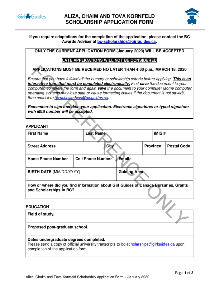 ELIZA, CHAIN AND NOVA CORNFIELD SCHOLARSHIP APPLICATION FORM If you require adaptations for the completion of the application, please contact the BC Awards Adviser at bcscholarships@girlguides.ca.