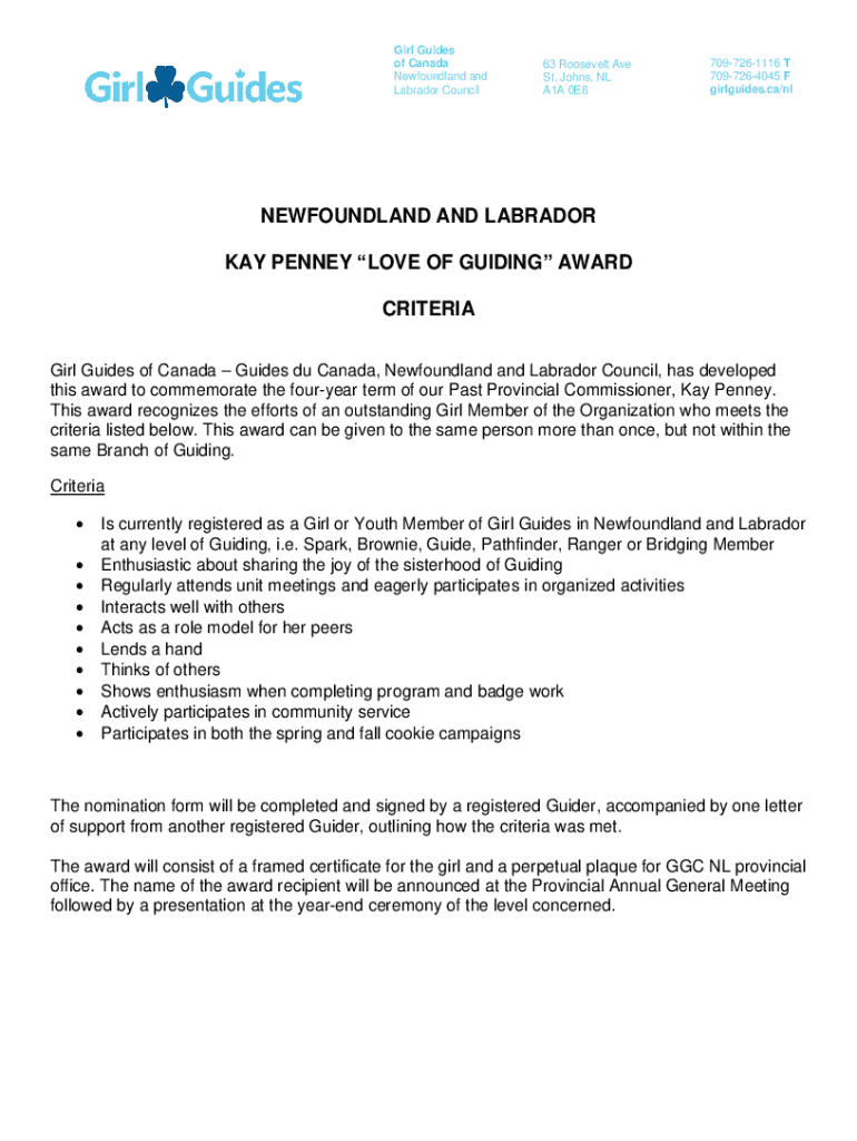 Girl Guides of Canada Newfoundland and Labrador Council63 Roosevelt Ave St. Johns, NL A1A 0E87097261116 T 7097264045 F girlguides.ca/nlNEWFOUNDLAND AND LABRADOR KAY PENNEY LOVE OF GUIDING AWARD CRITERIA