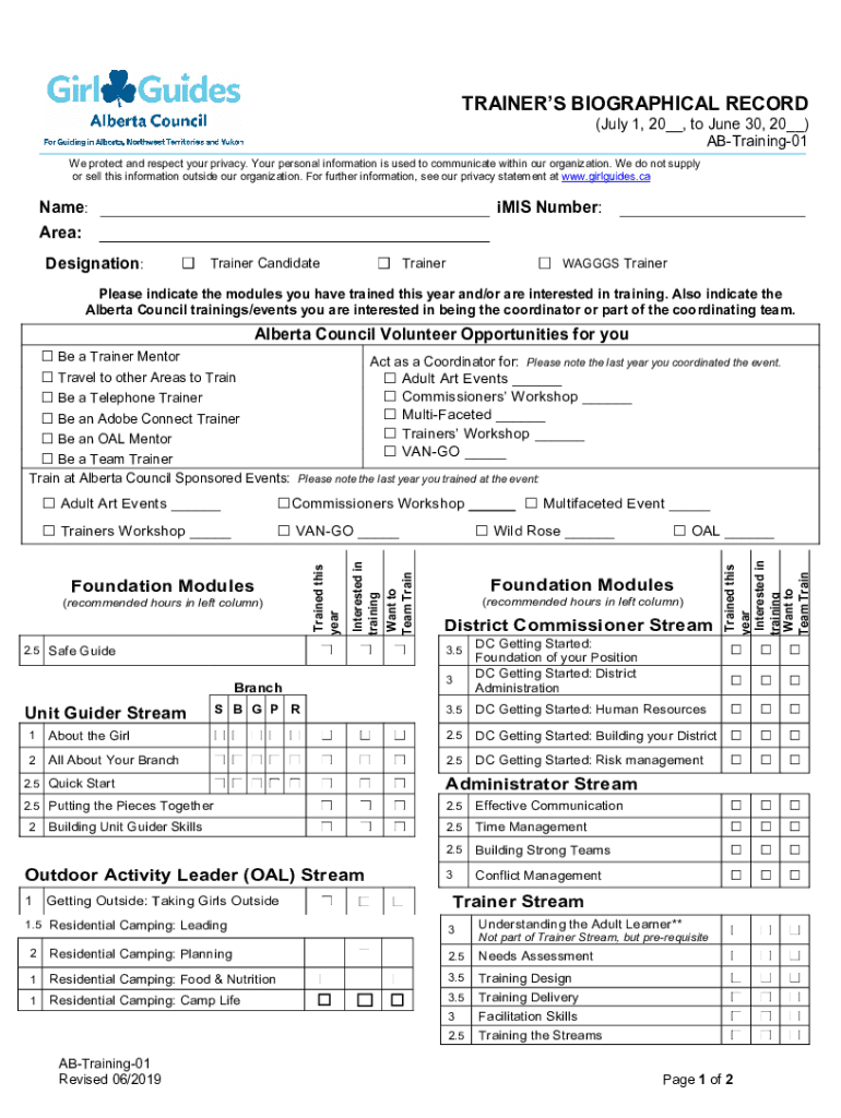 TRAINERS BIOGRAPHICAL RECORD(July 1, 20__, to June 30, 20__) ABTraining01We protect and respect your privacy. Your personal information is used to communicate within our organization. We do not supply