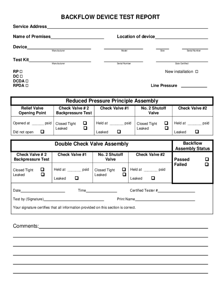 BACKFLOW DEVICE TEST REPORT Service Address Name of PremisesLocation of deviceDevice ManufacturerModelSizeManufacturerSerial NumberSerial Numberless Kit Date Certified RP DCD CDA PDA New installation