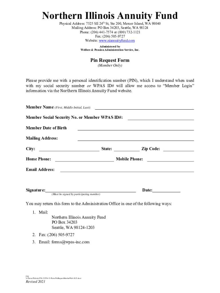 Northern Illinois Annuity Fund Physical Address: 7525 SE 24th St, Ste 200, Mercer Island, WA 98040 Mailing Address: PO Box 34203, Seattle, WA 98124 Phone: (206) 4417574 or (800) 7321121 Fax: (206)
