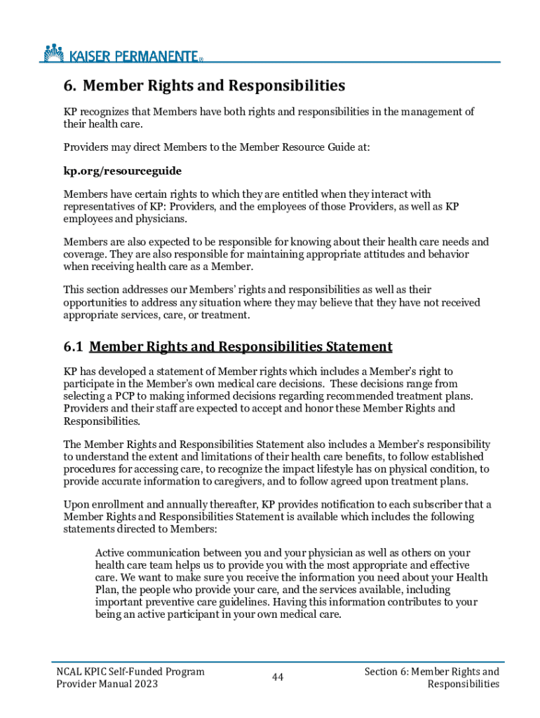 6. Member Rights and Responsibilities KP recognizes that Members have both rights and responsibilities in the management of their health care. Providers may direct Members to the Member Resource Guide