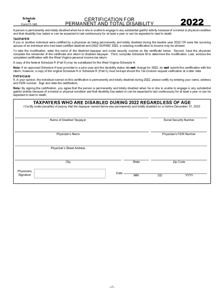 Schedule H Form IT1402022CERTIFICATION FOR PERMANENT AND TOTAL DISABILITY person is permanently and totally disabled when he or she is unable to engage in any substantial gainful activity because