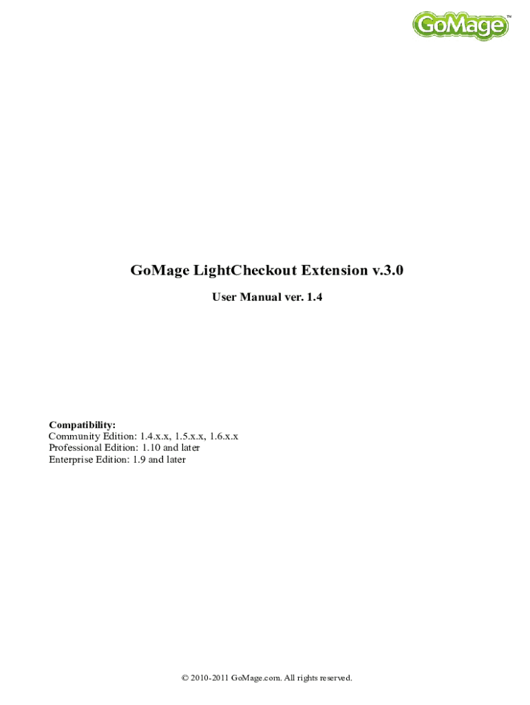 Homage LightCheckout Extension v.3.0 User Manual very. 1.4Compatibility: Community Edition: 1.4.×.x, 1.5.×.x, 1.6.×.x Professional Edition: 1.10 and later Enterprise Edition: 1.9 and later 20102011