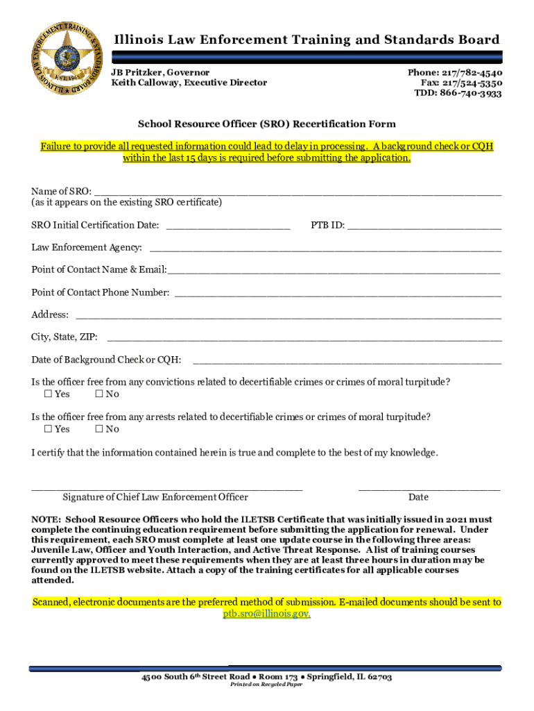 Illinois Law Enforcement Training and Standards Board JB Pritzker, Governor Keith Calloway, Executive DirectorPhone: 217/7824540 Fax: 217/5245350 TDD: 8667403933School Resource Officer (SRO) Recertification