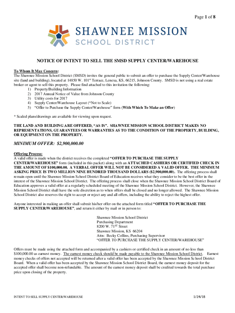 Page 1 of 8NOTICE OF INTENT TO SELL THE SMS SUPPLY CENTER/WAREHOUSE To Whom It May Concern: The Shawnee Mission School District (SMS) invites the public to submit an offer to purchase the Supply Center/Warehouse
