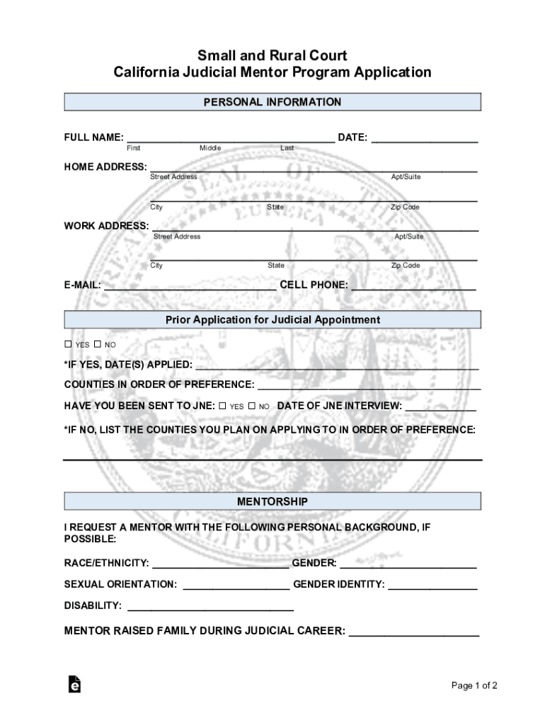 Small and Rural Court California Judicial Mentor Program Application PERSONAL INFORMATION FULL NAME: ___ DATE: ___ FirstMiddleLastHOME ADDRESS: ___ Street Address/Suite___ CityStateZip Bodywork ADDRESS: