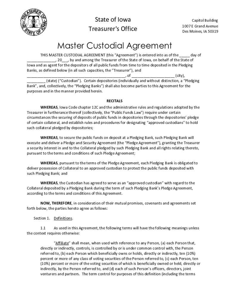 State of Iowa Treasurer\'s Office Capitol Building 1007 E Grand Avenue Des Moines, IA 50319Master Custodial Agreement THIS MASTER CUSTODIAL AGREEMENT (this Agreement) is entered into as of the ___
