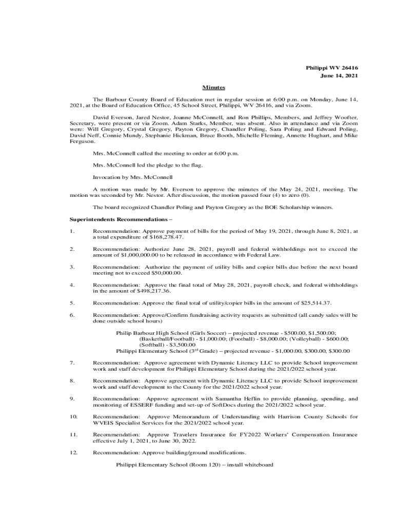 Philippe WV 26416 June 14, 2021, Minutes The Barbour County Board of Education met in regular session at 6:00 p.m. on Monday, June 14, 2021, at the Board of Education Office, 45 School Street, Philippe,