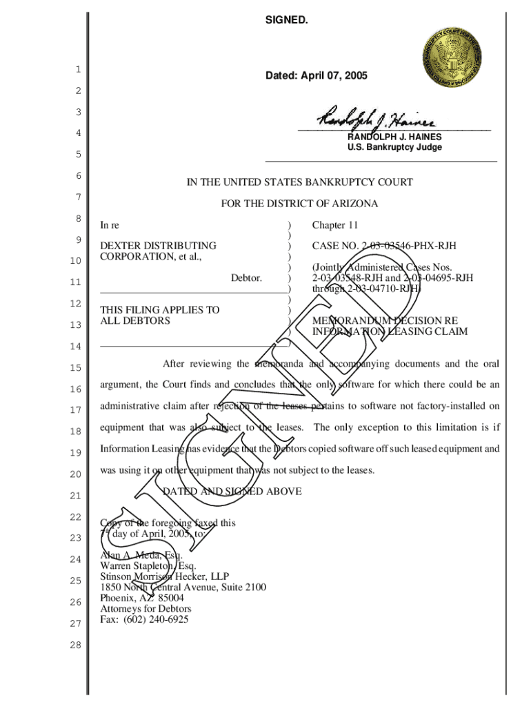 SIGNED.1Dated: April 07, 20052 3 ___ RANDOLPH J. HAINES U.S. Bankruptcy Judge4 5___6IN THE UNITED STATES BANKRUPTCY COURT79 10 11 12 13 14 15In re)) DEXTER DISTRIBUTING) CORPORATION, et al., ) ) Debtor.