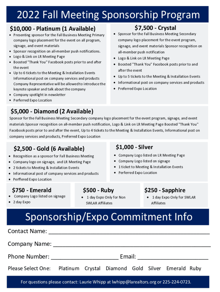2022 Fall Meeting Sponsorship Program $10,000 Platinum (1 Available)Presenting sponsor for the Fall Business Meeting Primary company logo placement for the event on all program, signage, and event