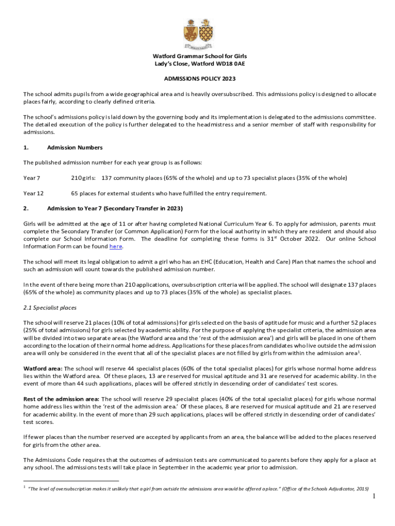 Watford Grammar School for Girls Lady's Close, Watford WD18 0AE ADMISSIONS POLICY 2023 The school admits pupils from a wide geographical area and is heavily oversubscribed. These admissions' policy