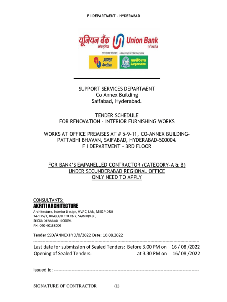 F I DEPARTMENT HYDERABADSUPPORT SERVICES DEPARTMENT Co Annex Building Sadiqabad, Hyderabad. TENDER SCHEDULE FOR RENOVATION INTERIOR FURNISHING WORKS AT OFFICE PREMISES AT # 5911, CHANNEL BUILDINGPATTABHI