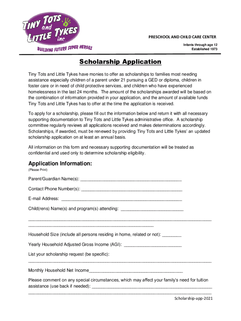 PRESCHOOL AND CHILD CARE CENTER Infants through age 12 Established 1973Scholarship Application Tiny Tots and Little Tykes have monies to offer as scholarships to families most needing assistance especially