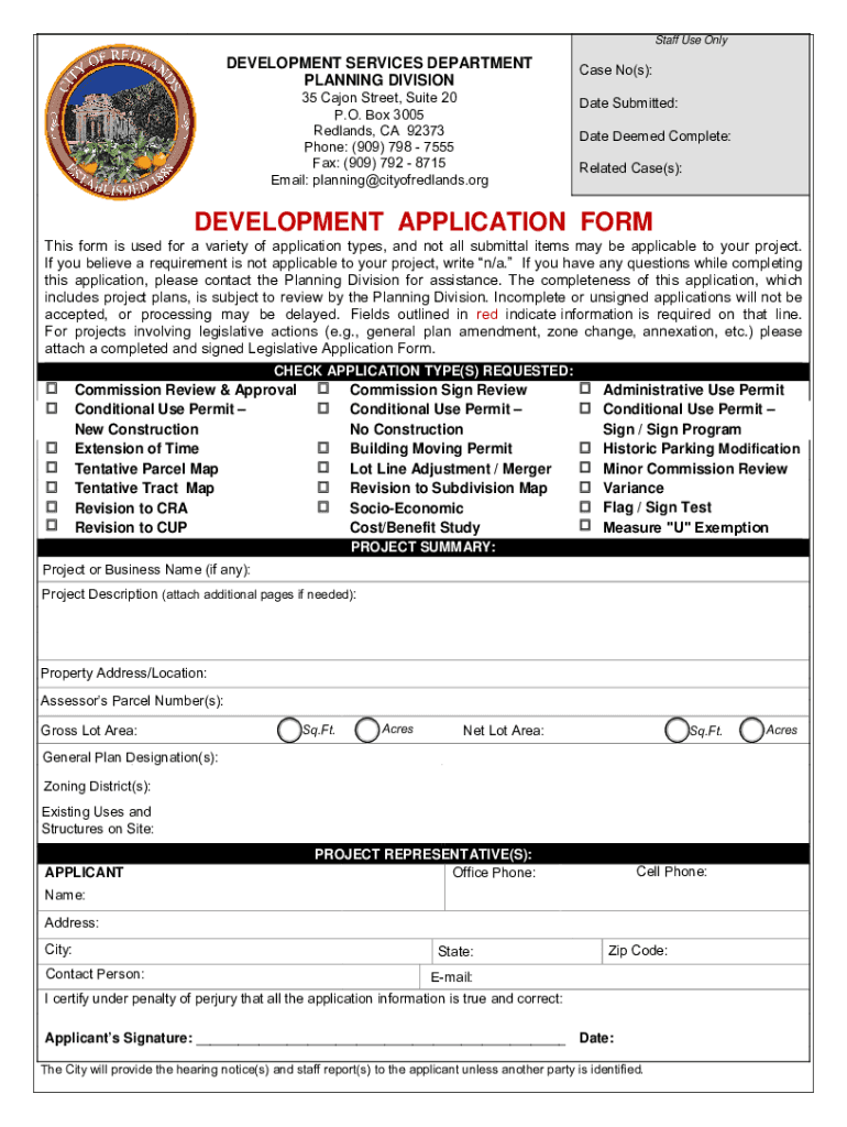 Staff Use OnlyDEVELOPMENT SERVICES DEPARTMENT PLANNING DIVISION 35 Canon Street, Suite 20 P.O. Box 3005 Redlands, CA 92373 Phone: (909) 798 7555 Fax: (909) 792 8715 Email: planning@cityofredlands.orgCase