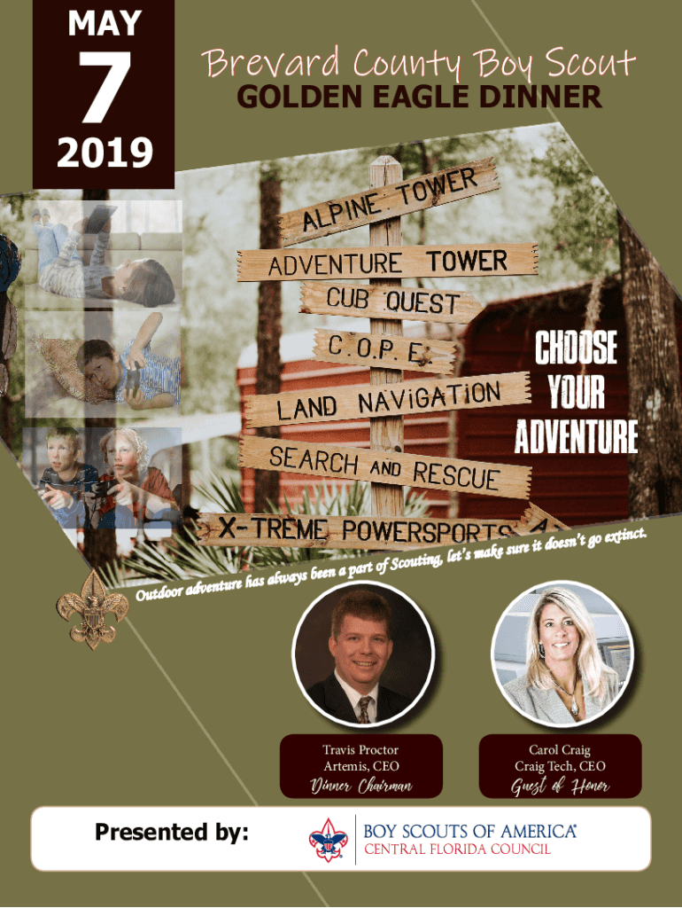 MAY7 2019Brevard County Boy Scout golden EAGLE DINNERcHOOSE YOUR Adventure Outdoor adventure has apart from always beenScouting, Travis Proctor Artemis, Dinner ChairmanPresented by:your it doesn't