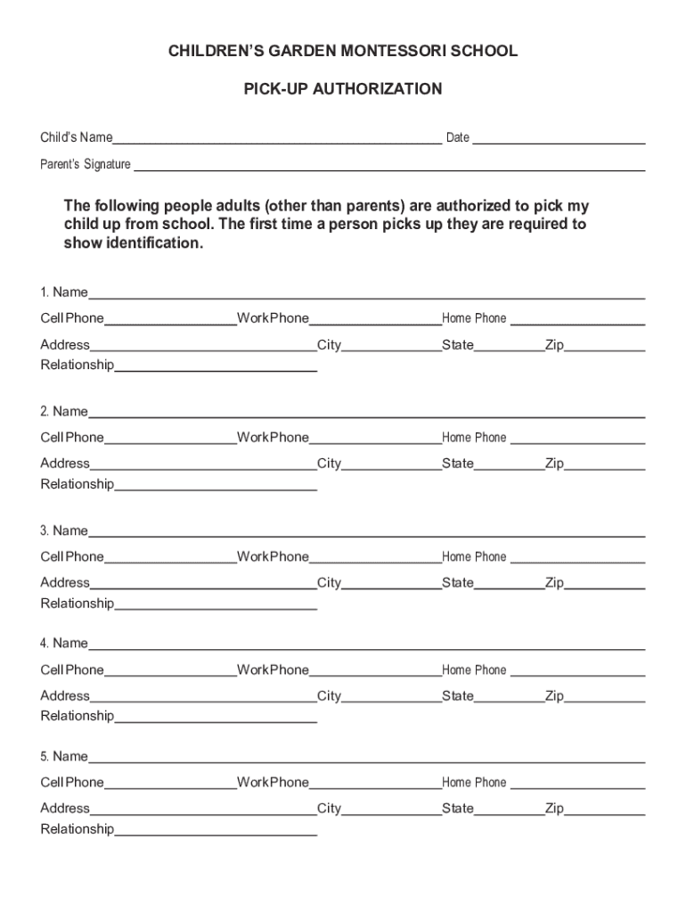 CHILDREN GARDEN MONTESSORI SCHOOL PICKUP AUTHORIZATION Child's NameDateParents Signature following people adults (other than parents) are authorized to pick my child up from school. The first time
