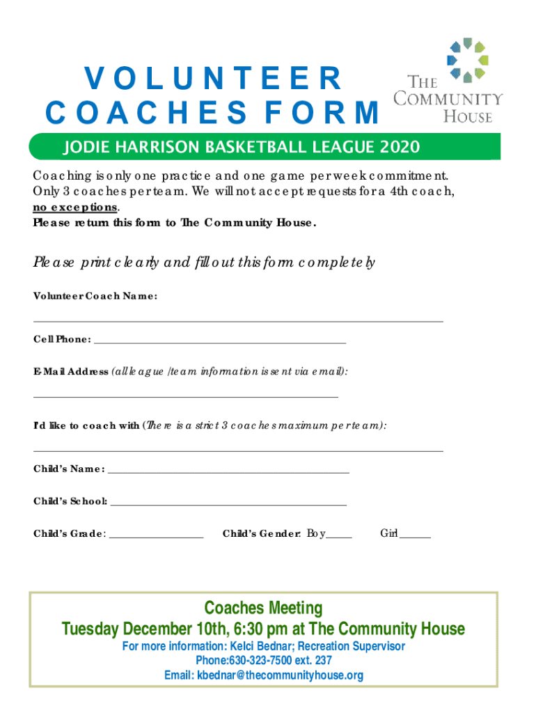 VOLUNTEER COACHES FORM JODIE HARRISON BASKETBALL LEAGUE 2020 Coaching is only one practice and one game per week commitment. Only 3 coaches per team. We will not accept requests for a 4th coach, no