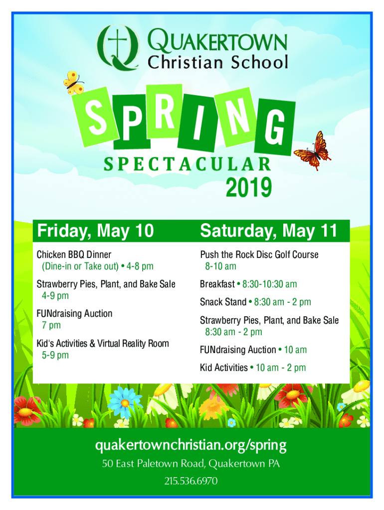 UAKERTOWNChristian School2019 Friday, May 10Saturday, May 11Chicken BBQ Dinner (Dinah or Take out) 48 push the Rock Disc Golf Course 810 strawberry Pies, Plant, and Bake Sale 49 breakfast 8:3010:30