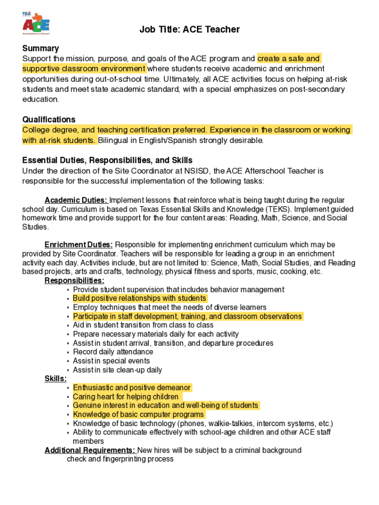 Job Title: ACE Teacher Summary Support the mission, purpose, and goals of the ACE program and create a safe and supportive classroom environment where students receive academic and enrichment opportunities