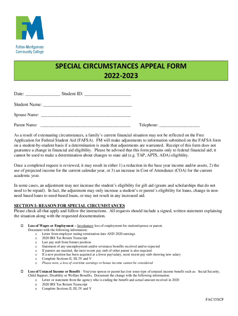 SPECIAL CIRCUMSTANCES APPEAL FORM 20222023 Date: ___ Student ID: ___ Student Name: ___ Spouse Name: ___ Parent Name: ___Telephone: ___As a result of extenuating circumstances, a families current financial