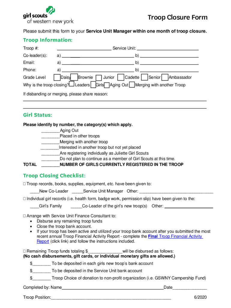 Troop Closure Form Please submit this form to your Service Unit Manager within one month of troop closure. Troop Information: Troop #:Service Unit:Coleader(s):a)___b)Email:a)___b)Phone:a)___b)Grade