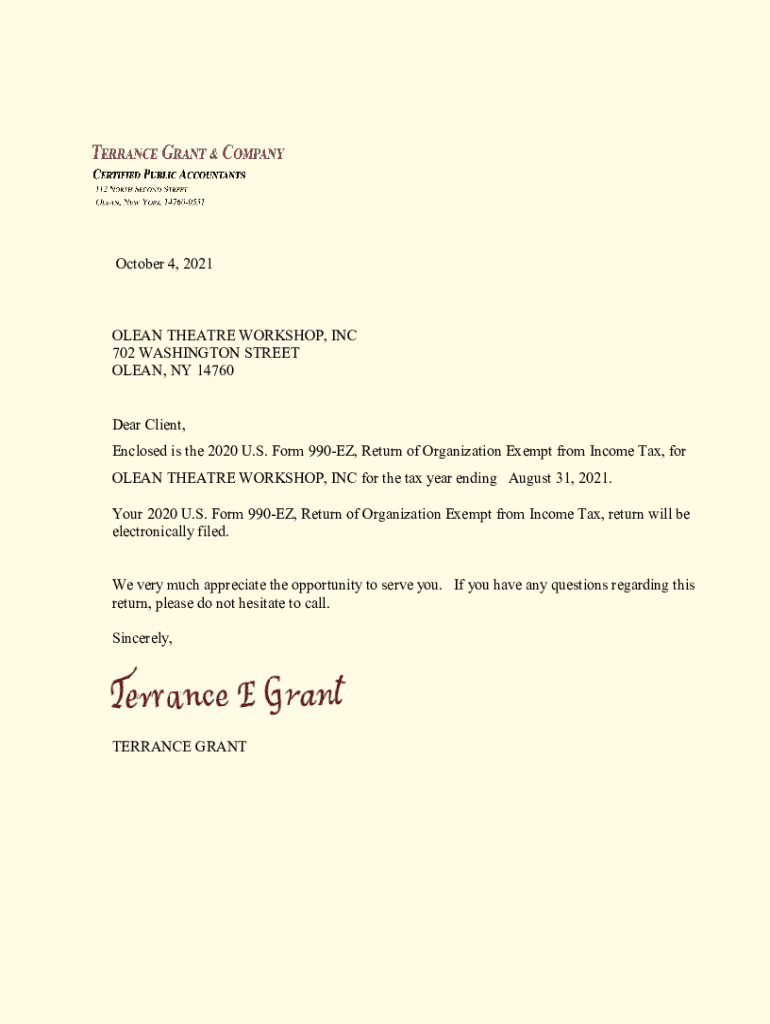 October 4, 2021OLEAN Theater WORKSHOP, INC 702 WASHINGTON STREET CLEAN, NY 14760 Dear Client, Enclosed is the 2020 U.S. Form 990EZ, Return of Organization Exempt from Income Tax, for CLEAN Theater
