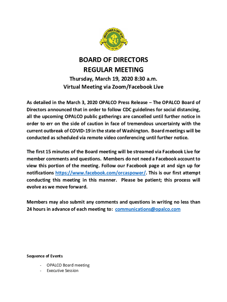 BOARD OF DIRECTORS REGULAR MEETING Thursday, March 19, 2020 8:30 a.m. Virtual Meeting via Zoom/Facebook Live As detailed in the March 3, 2020, OPAL CO Press Release The OPAL CO Board of Directors