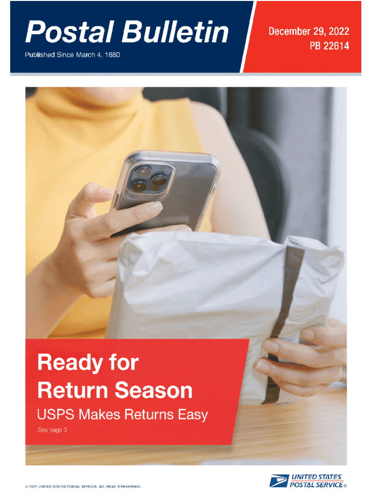 Front Cover2postal bulletin 22614 (122922)Contents COVER STORY USPS is Ready for the Holiday Returns Season. . . . . . . . . .3POLICIES, PROCEDURES, AND FORMS UPDATESUpdate: Stamp Announcement 236: