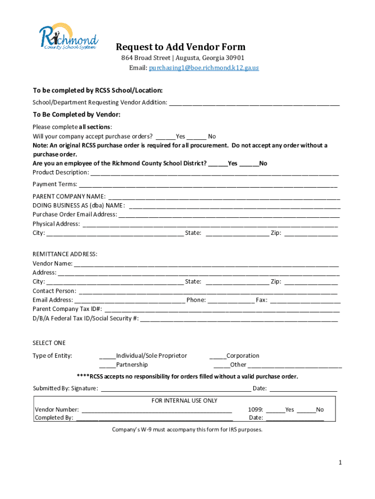 864 Broad Street Augusta, Georgia 30901 Department of Budget and Finance Dear Vendor: Thank you for your interest in doing business with the Richmond County School System (ROSS). Your company can
