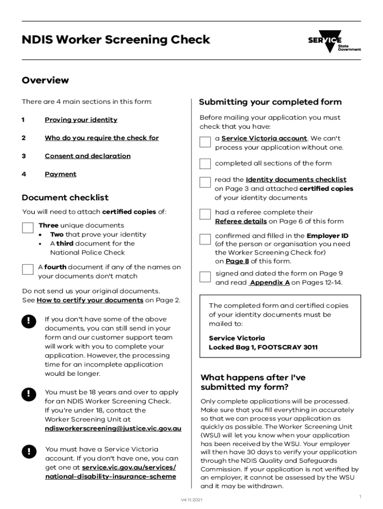 NDIS Worker Screening Check Overview There are 4 main sections in this form:Submitting your completed form1Proving your identityBefore mailing your application you must check that you have:2Who do
