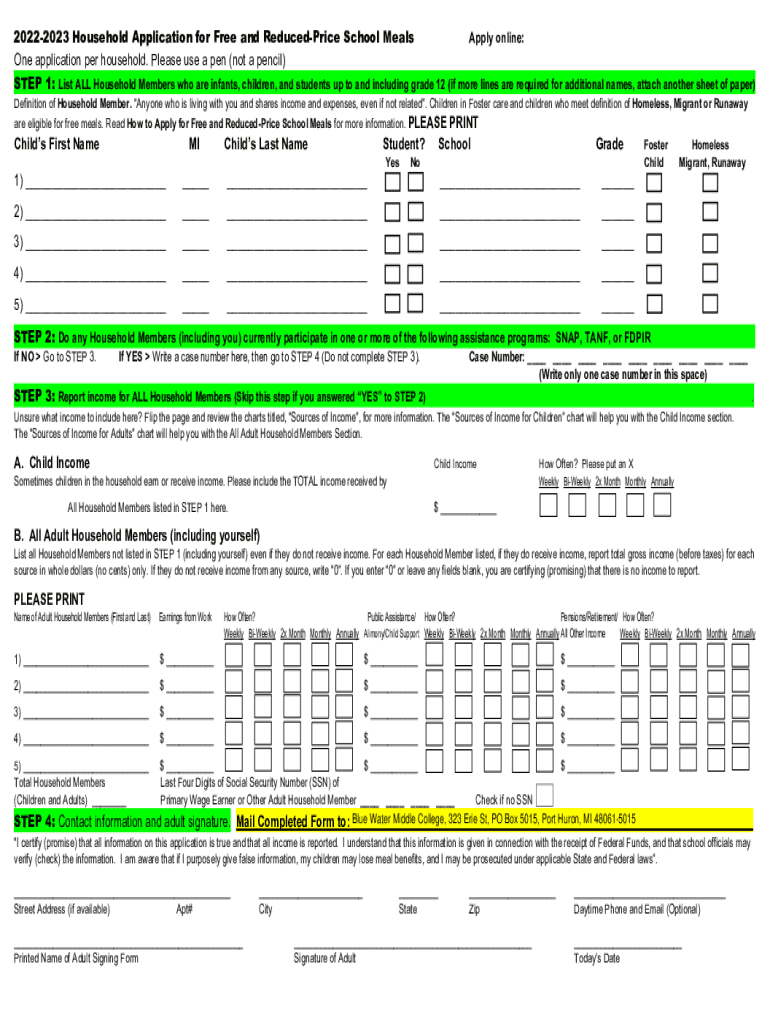 20222023 Household Application for Free and Reduced Price School Meals Apply online: One application per household. Please use a pen (not a pencil) STEP 1: List ALL Household Members who are infants,