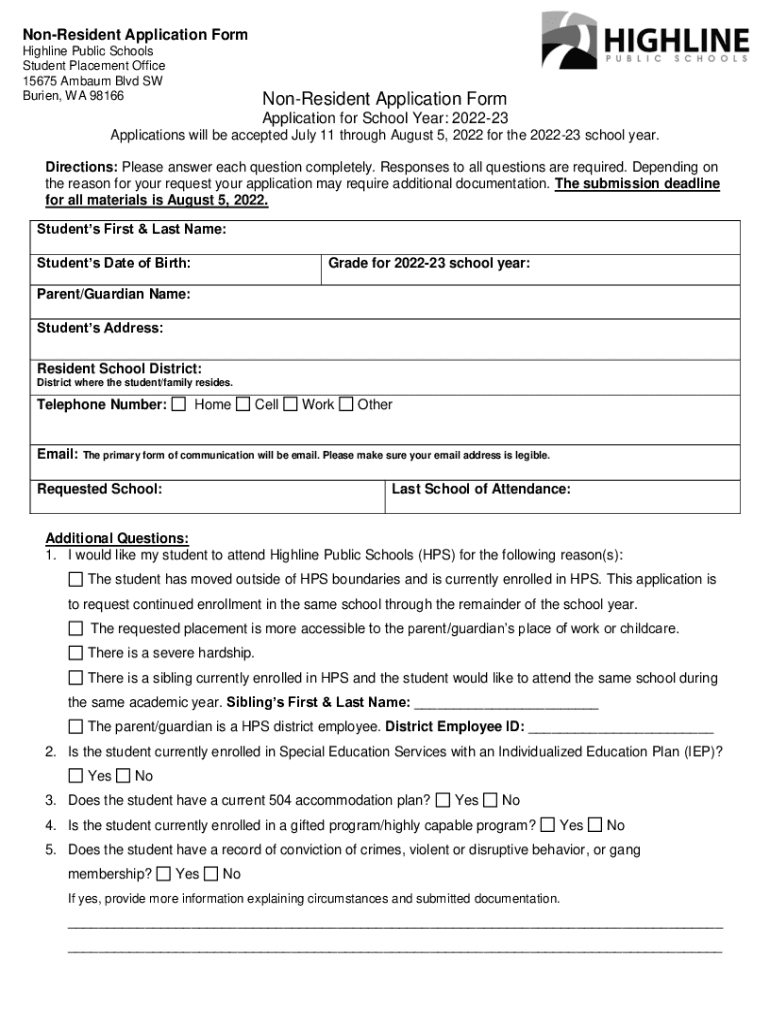 Nonresident Application Form High line Public Schools Student Placement Office 15675 Album Blvd SW Buried, WA 98166NonResident Application Form Application for School Year: 202223Applications will
