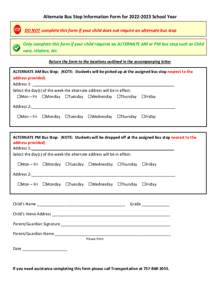 Alternate Bus Stop Information Form for 20222023 School Year DO NOT complete this form if your child does not require an alternate bus stop Only complete this form if your child requires an ALTERNATE