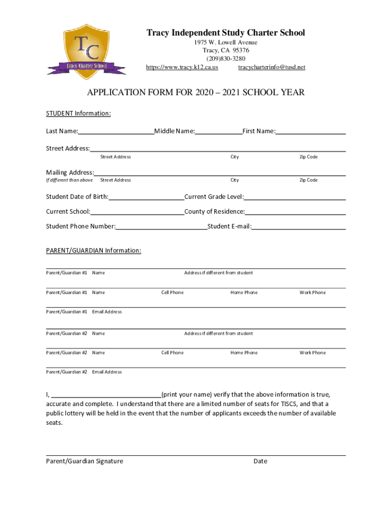 Tracy Independent Study Charter School 1975 W. Lowell Avenue Tracy, CA 95376 (209)8303280 https://www.tracy.k12.ca.us tracycharterinfo@tusd.netAPPLICATION FORM FOR 2020 2021 SCHOOL YEAR STUDENT Information: