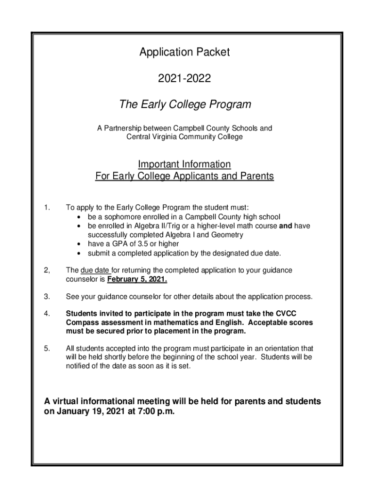 Application Packet 20212022 The Early College Program A Partnership between Campbell County Schools and Central Virginia Community CollegeImportant Information For Early College Applicants and Parents