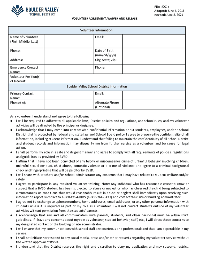 File: ICE Adopted: June 4, 2013, Revised: June 8, 2021, VOLUNTEER AGREEMENT, WAIVER AND RELEASEVolunteer Information Name of Volunteer (First, Middle, Last)Email:Phone:Date of Birth (mm/dd/YYY) City,