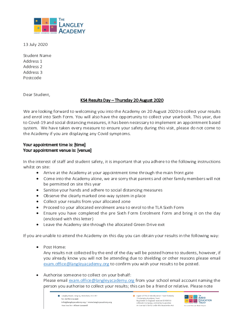 13 July 2020 Student Name Address 1 Address 2 Address 3 PostcodeDear Student, KS4 Results Day Thursday 20 August 2020 We are looking forward to welcoming you into the Academy on 20 August 2020 to