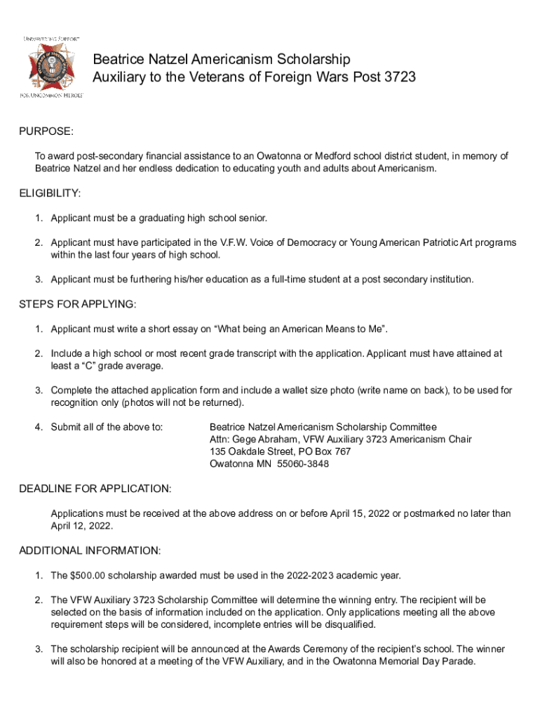 Students who meet the eligibility criteria set by the scholarship program are required to file for the Beatrice Natzel Americanism Scholarship.
