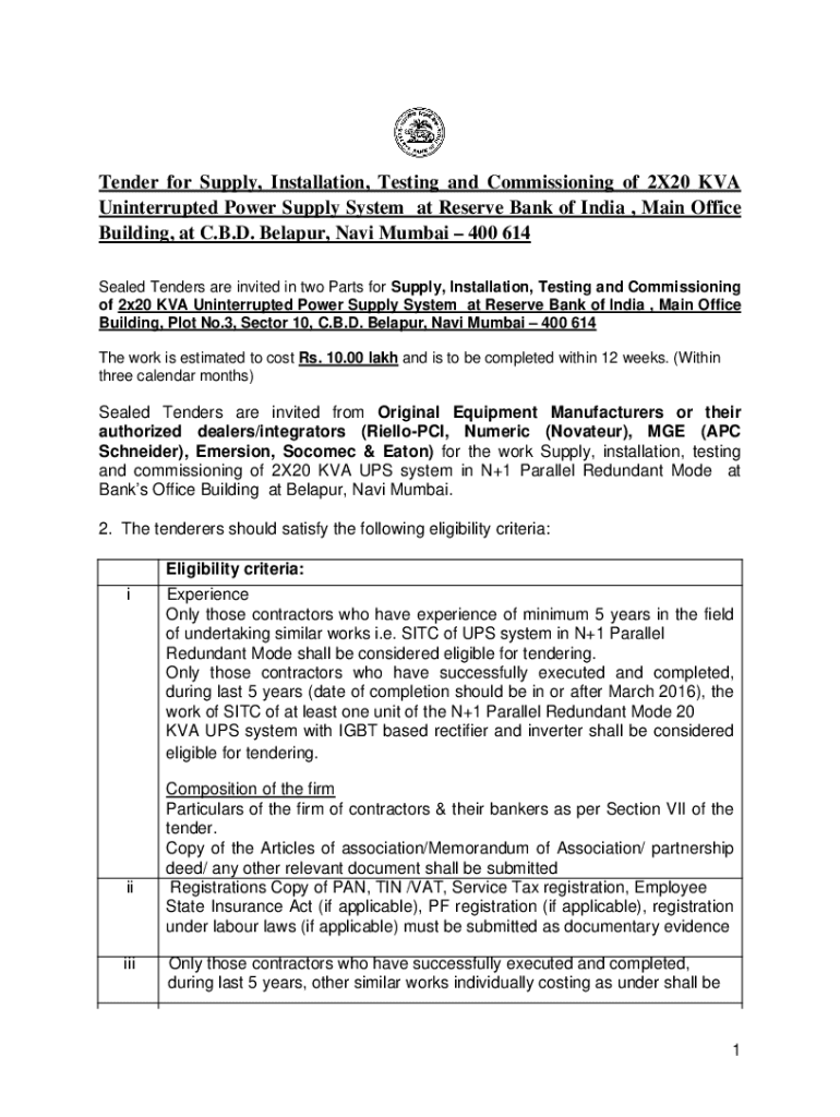 Tender for Supply, Installation, Testing and Commissioning of 2×20 AVA Uninterrupted Power Supply System at Reserve Bank of India, Main Office Building, at C.B.D. Belarus, Navi Mumbai 400 614 Sealed