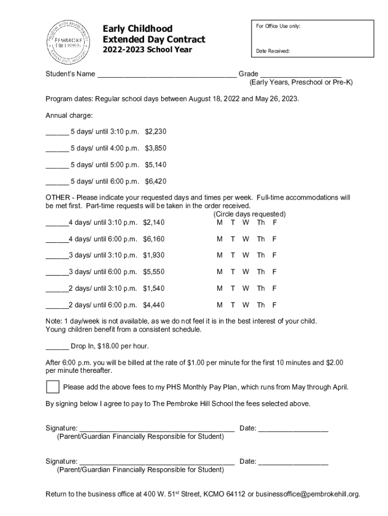 Early Childhood Extended Day Contractor Office Use only:20222023 School Yardage Received:Students Name ___ Grade ___ (Early Years, Preschool or Prey) Program dates: Regular school days between August